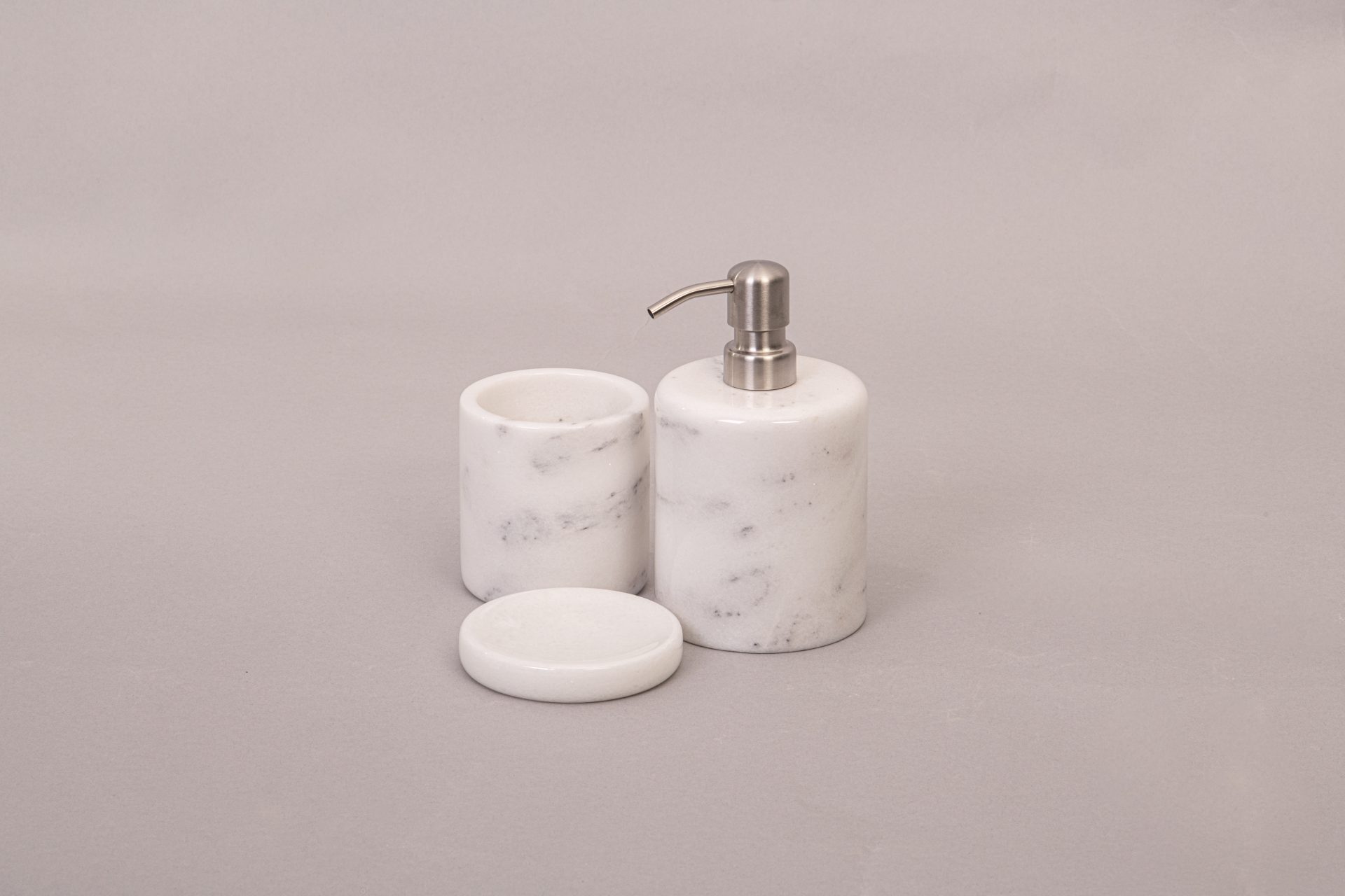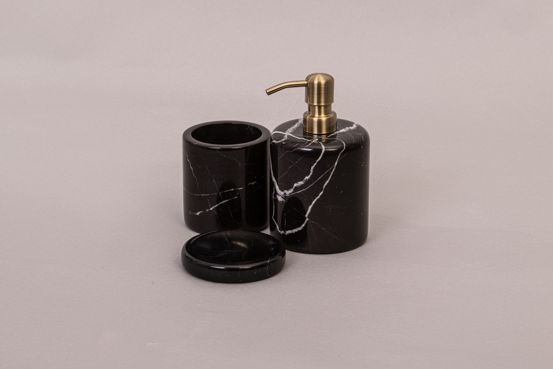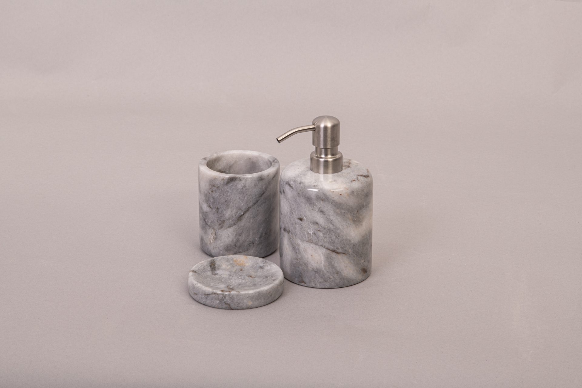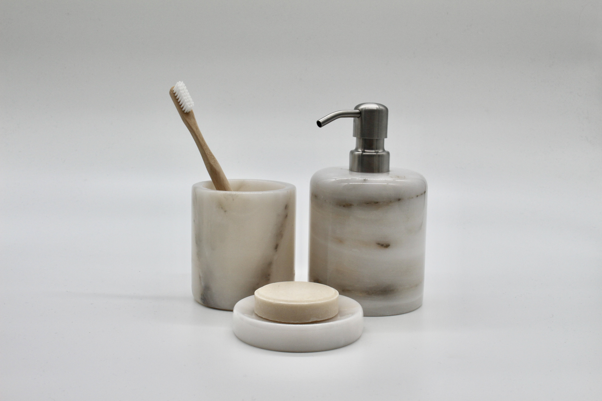 Das „marmortrend Badezimmer Set“ macht Ihr Badezimmer mit seiner Eleganz einzigartig. Es besteht aus einem Seifenspender, einer Seifenschale und einem Vorratsdose/Zahnputzbecher. Das tolle Stück aus der Natur in Kombination mit einem einzigartigen Farbspiel wird Sie begeistern.
