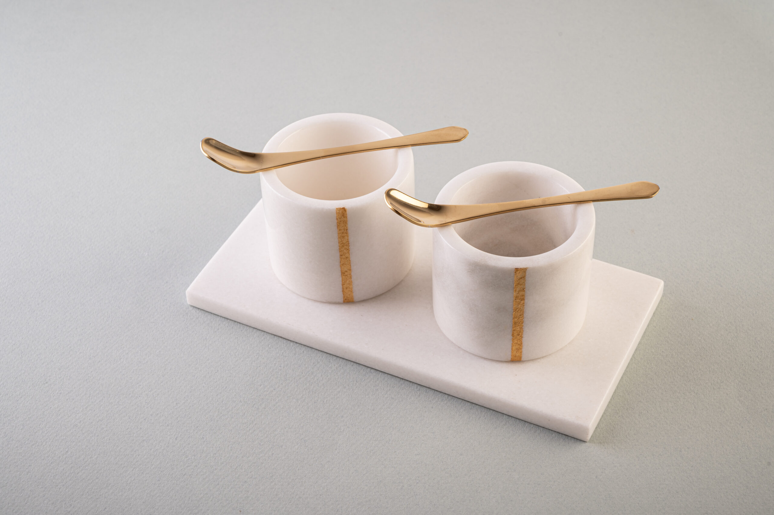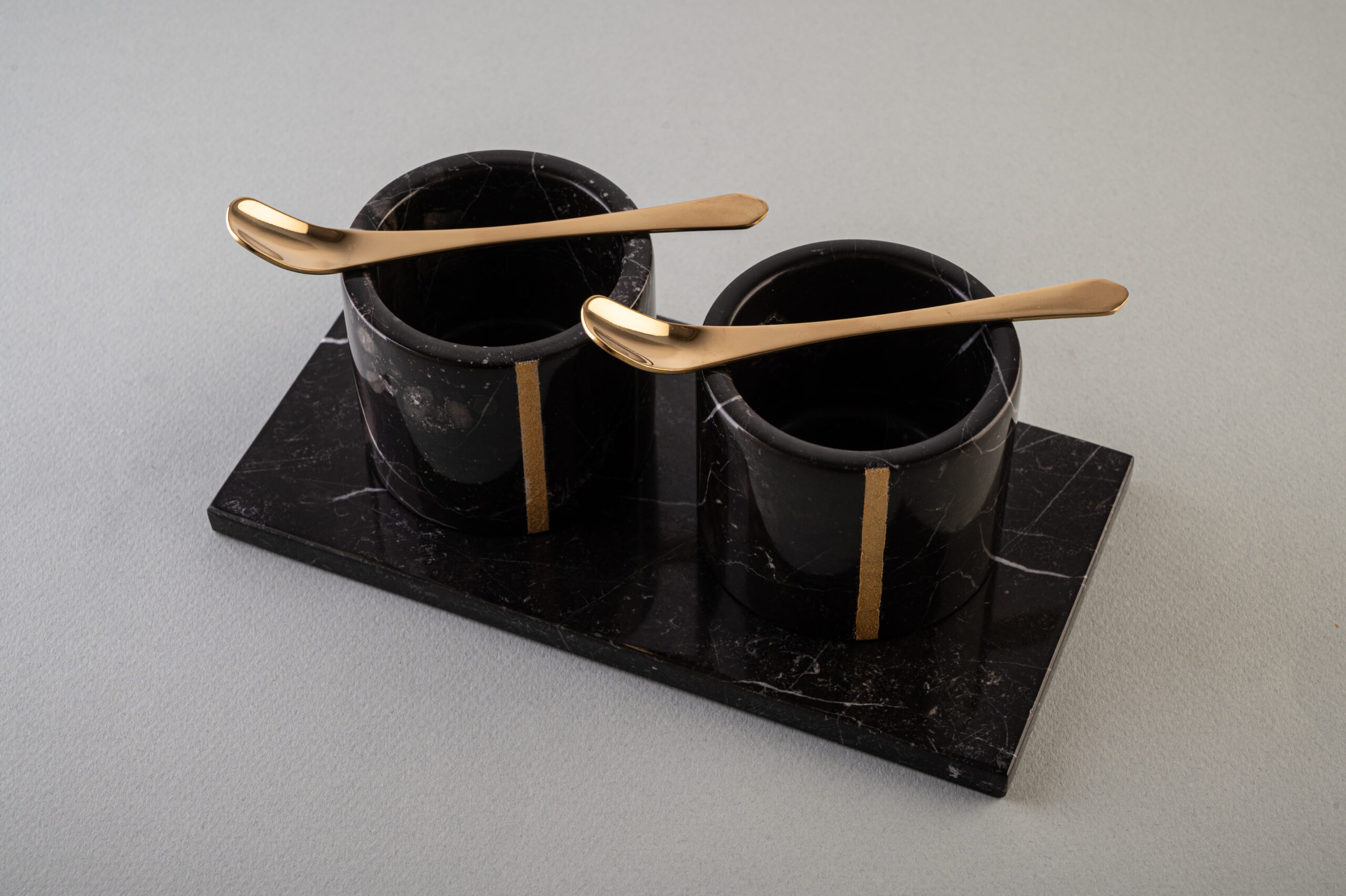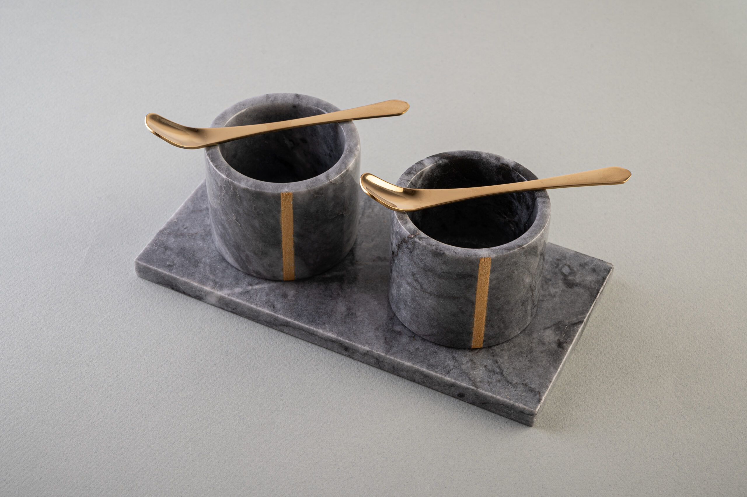 Das Set besteht aus zwei Gewürzbehälter, einem Untersetzer und zwei Löffel.