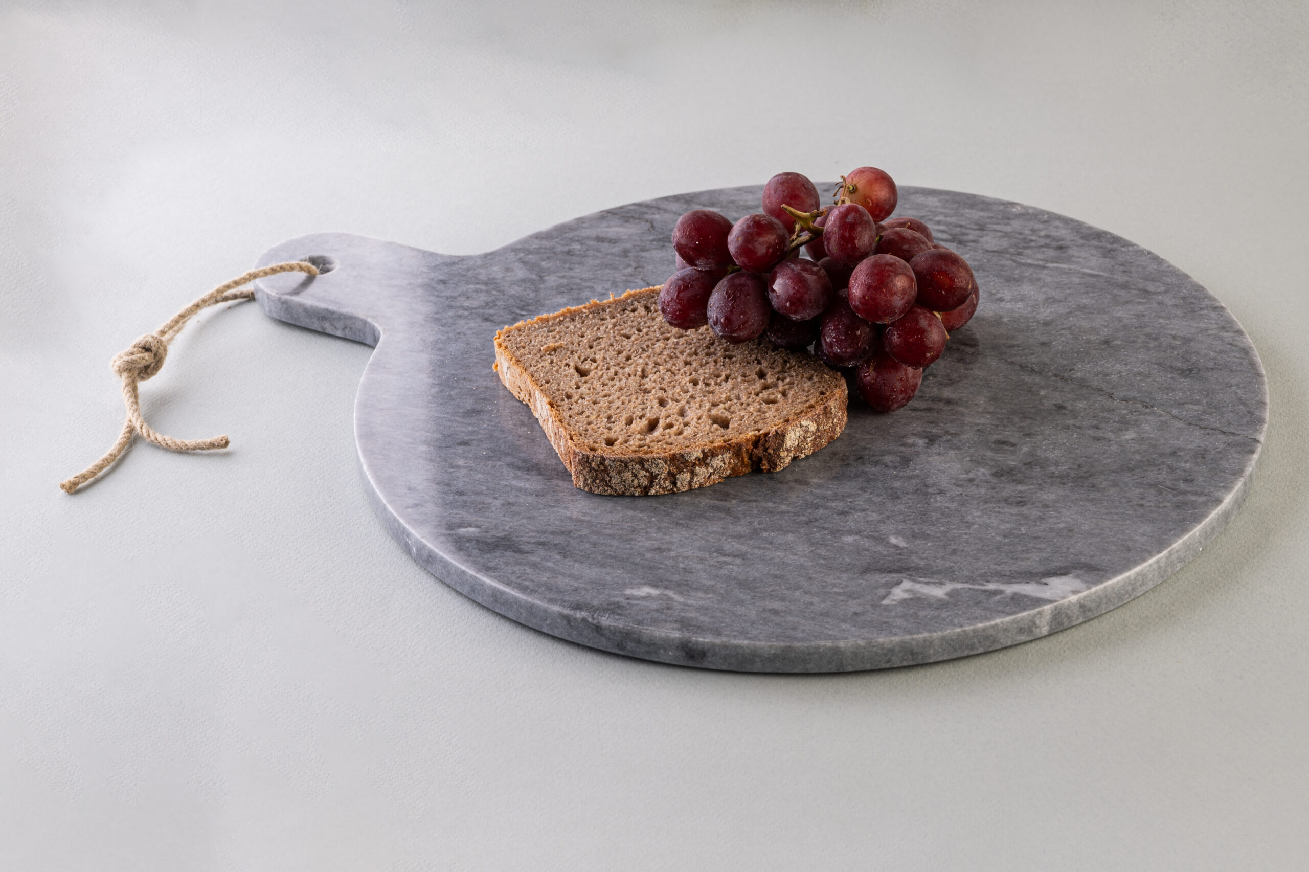 Das Schneidebrett von Marmor fällt durch seine schöne, naturnahe Textur ins Auge. Es ist für vielzählige Küchenarbeiten verwendbar.