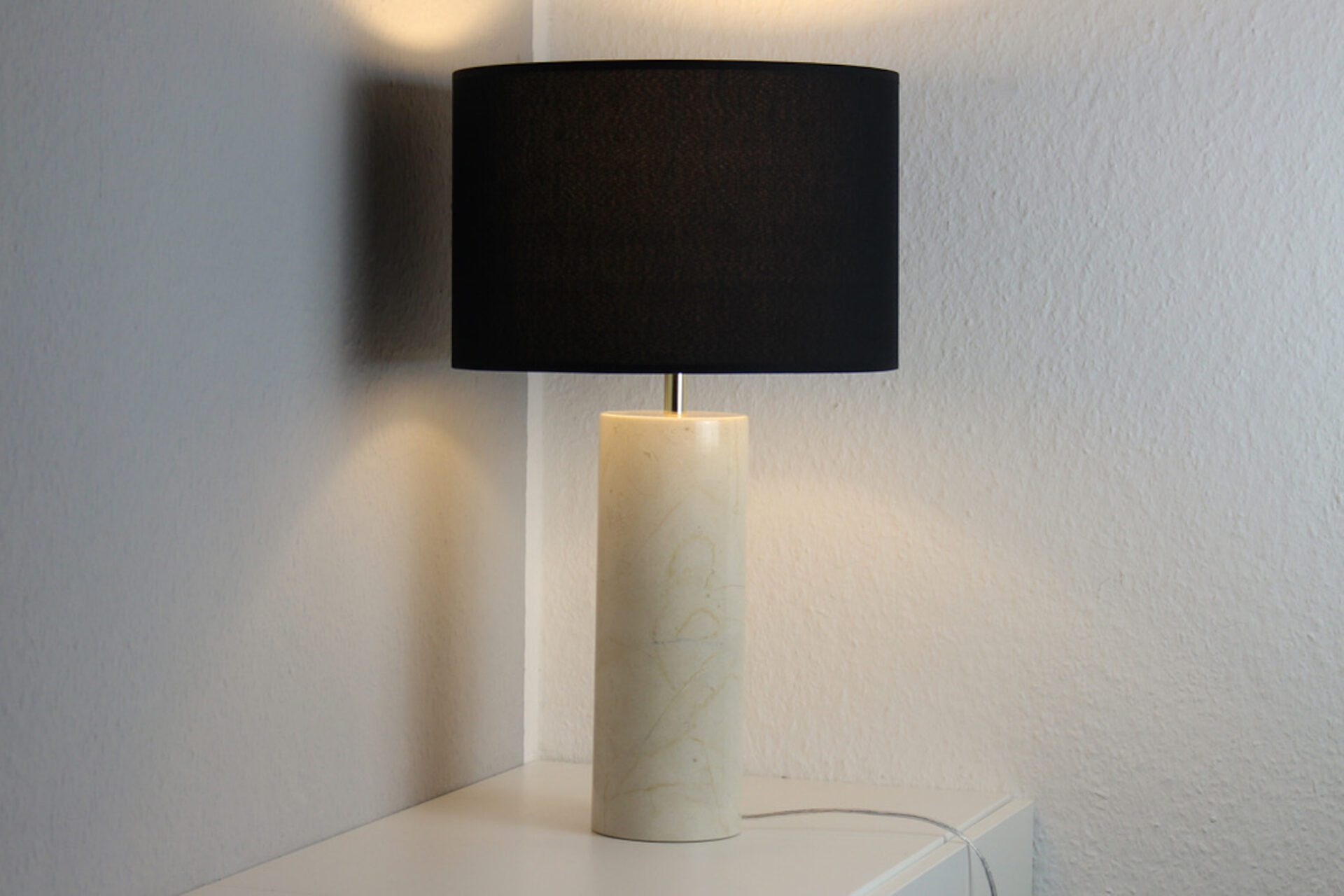 Die Tischlampe SERENA kombiniert hochwertigen Marmor mit einem Stoffschirm. Aufgrund ihrer stilvollen Erscheinung eignet sie sich für zahlreiche Einsatzgebiete, wie zum Beispiel das Wohnzimmer oder das Schlafzimmer. Diese Tischlampe SERENA wird aus Naturstein hergestellt.